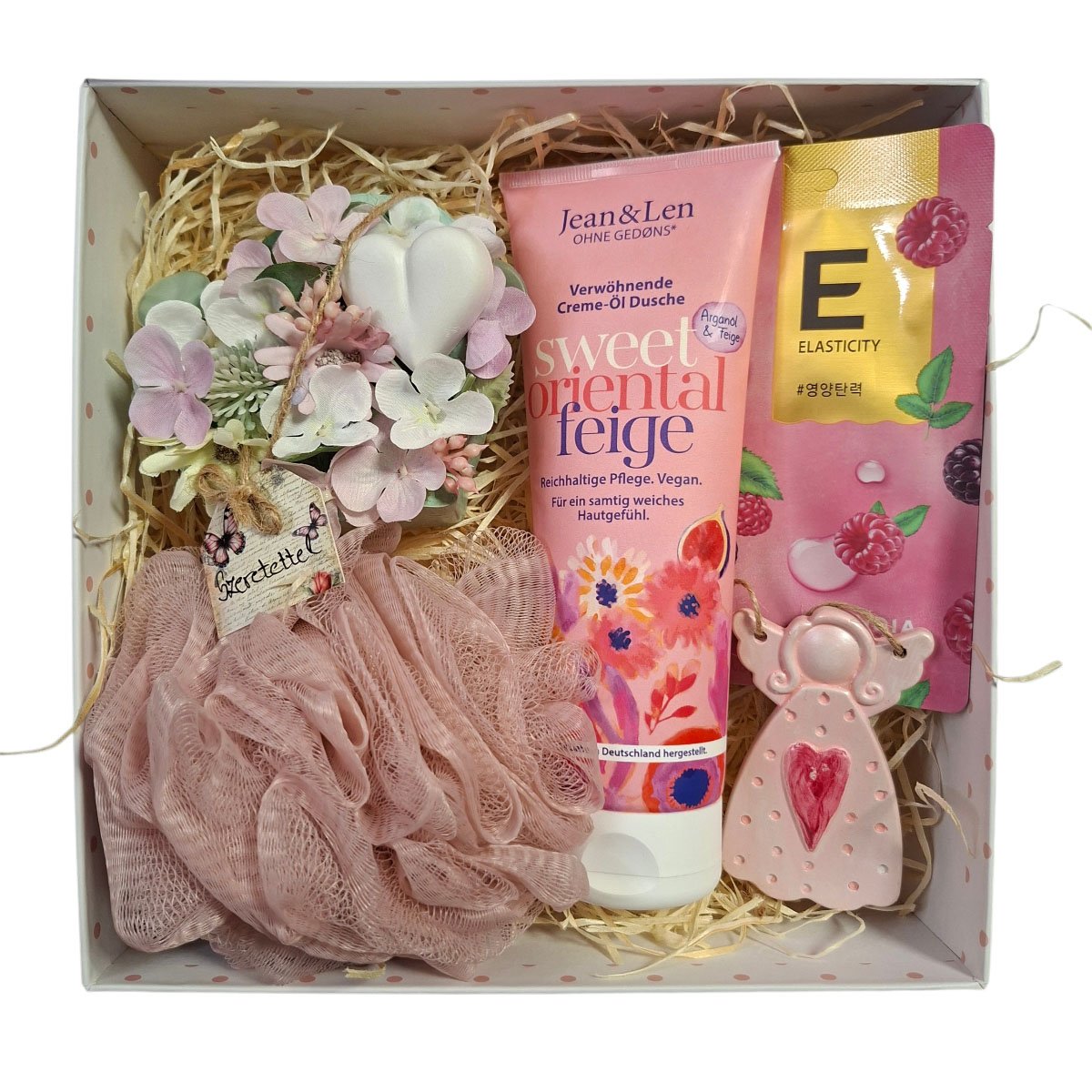 Az Édes Fügevarázs Ajándékbox egy elegáns, nőies és kényeztető ajándékcsomag, amely a füge édes–orientális illatát ötvözi a gyümölcsös arcápolással és a romantikus virágdíszekkel. A Jean & Len Sweet Oriental Feige krém‑olaj tusfürdő gazdag, tápláló formulával ápolja a bőrt, miközben selymes, meleg, édes illatot hagy maga után. A gyümölcsös fátyolmaszk frissítő, hidratáló élményt nyújt, a szív virág dekor és a kerámia jellegű angyalka pedig szeretetteljes, harmonikus hangulatot ad a csomagnak.