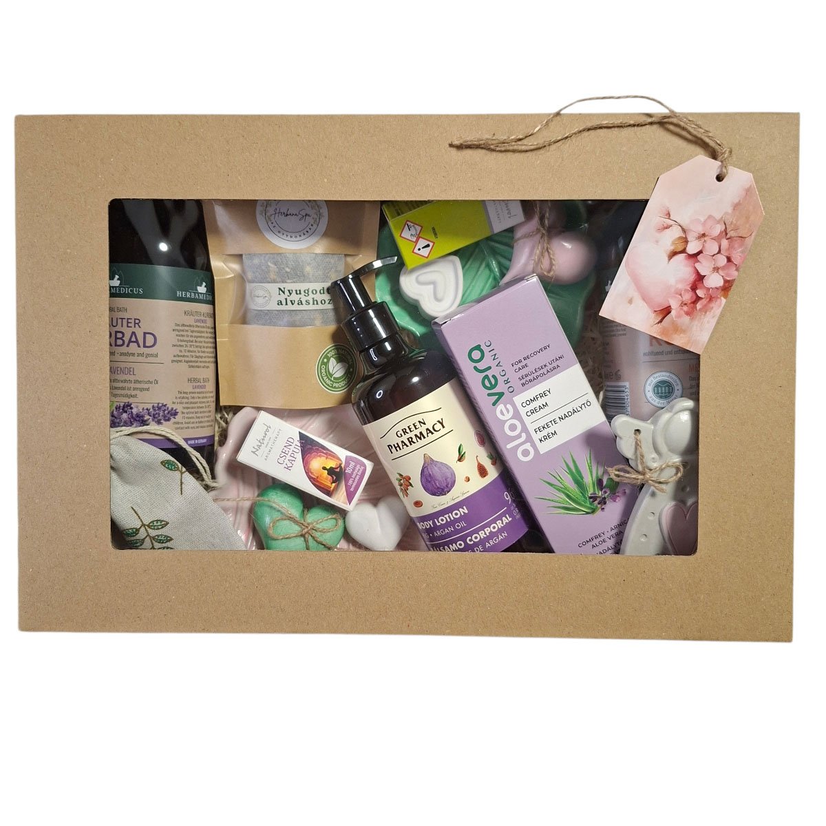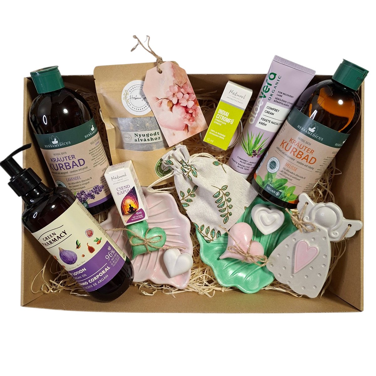 Teremtse meg a tökéletes esti rituálét egy csésze teával, miközben elmerül egy kád meleg vízben, amelyhez a levendulás vagy citromfüves fürdőkoncentrátumot és a „Nyugodt alváshoz” gyógynövénykeveréket (kamilla, citromfű, levendula) adta. A 100% tisztaságú „Csend Kapuja” és Indiai citromfű illóolajokból cseppentsen a fürdővízbe vagy keverje masszázsolajhoz a mélyebb relaxációért. Fürdés után kényeztesse bőrét a fügés testápolóval, a fáradt izmait pedig ápolja a fekete nadálytő krémmel. A kézzel készült kerámia jellegű tálkák, a dekoratív angyalka és a mécses fénye megteremti a tökéletes környezetet a Közöspillanatok párok élményéhez, a Léleksimogató női és párok én-időhöz, vagy az Édesálom női és párok és a Kisszünet női pihenés előtti teljes ellazuláshoz. A szett stílusos és praktikus eleme a mintás juta zsák, amely kiváló az illóolajok vagy gyógynövények tárolására.