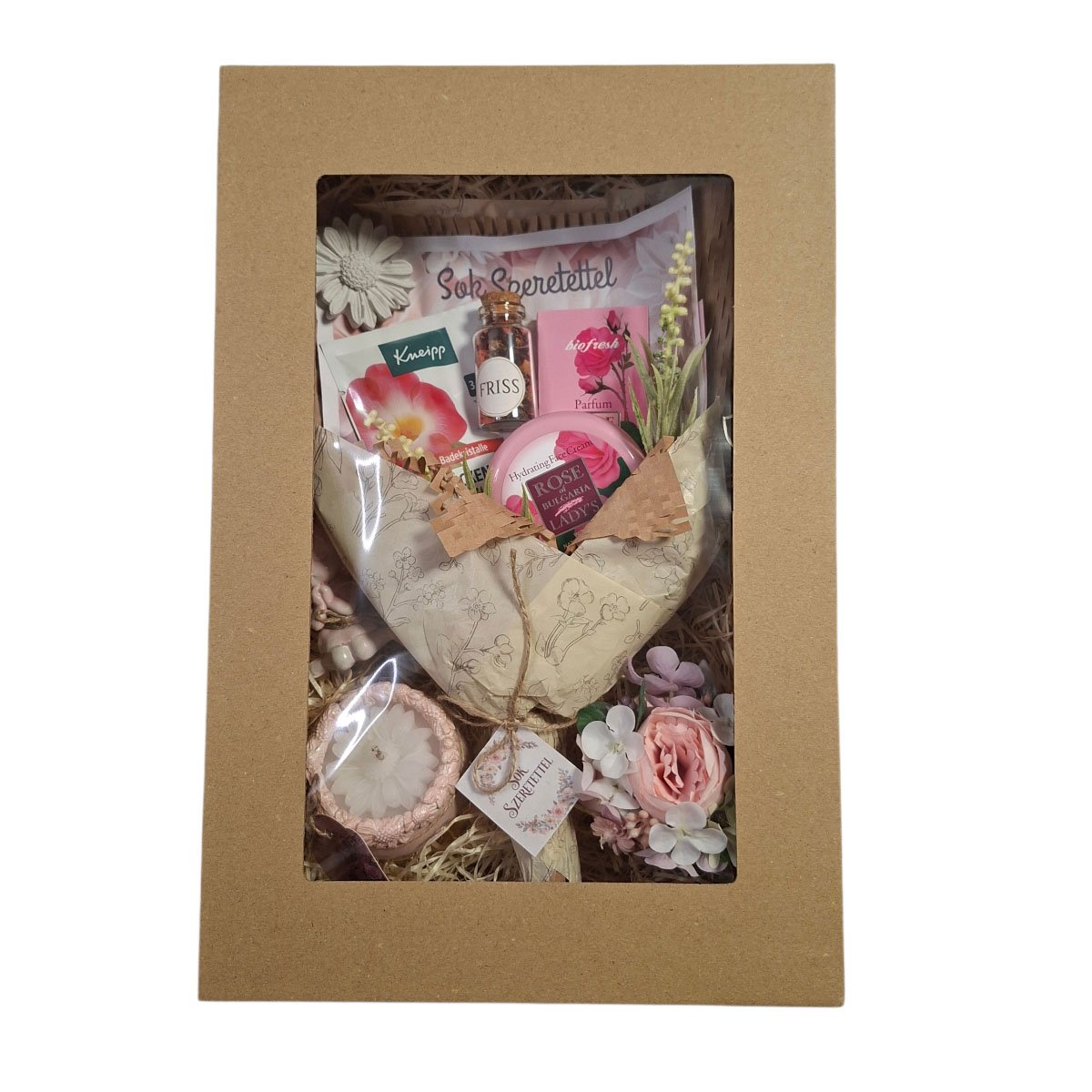 A Rózsafuvallat Relax Wellness Ajándékbox egy elegáns, nőies ajándékcsomag, amely a rózsa finom illatát és a pihentetői otthoni wellness élményt ötvözi. A Kneipp lazító fürdőkristály aromaterápiás hatású, míg a Biofresh rózsás arckrém és parfümolaj romantikus, virágos illatvilágot biztosít. A termékek dekoratív virágkompozícióval, kellemes illatú dekoráció üvegben és kézzel készített jellegű díszítőelemekkel együtt, natúr fagyapottal bélelt, ablakos kraft díszdobozban kerülnek elrendezésre.