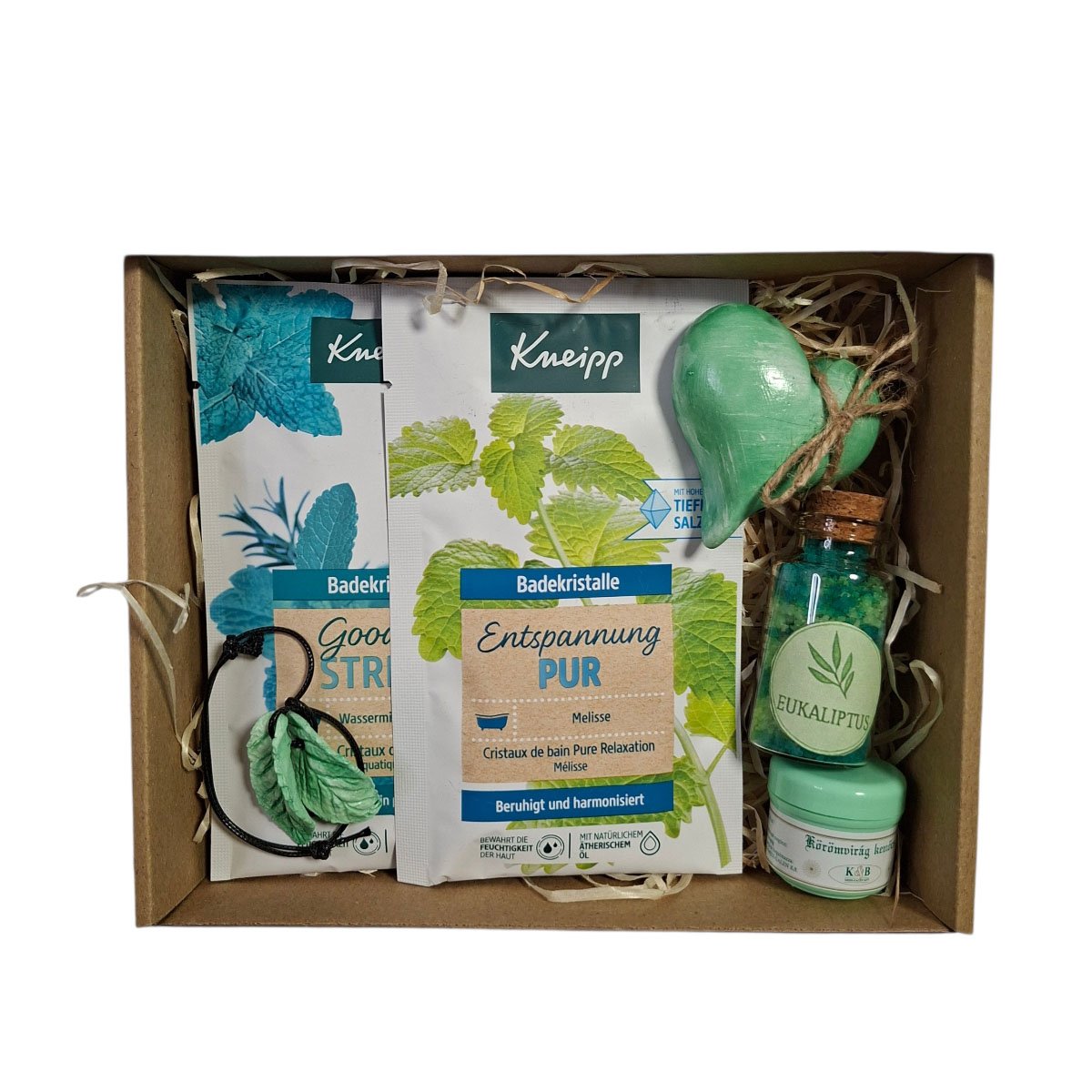 A csomag tartalma • Kneipp „Goodbye Stress” fürdőkristály (60 g) • Kneipp „Tiszta Relaxáció” fürdőkristály (60 g) • Eukaliptusz illat üvegben • Kovács körömvirágkrém (10 ml) • Zöld szív alakú kis kedvesség (nem kozmetikum) • Zöld levél alakú dísz • Natúr fagyapot • Kraft ablakos ajándékdoboz + ajándékkísérő kártya